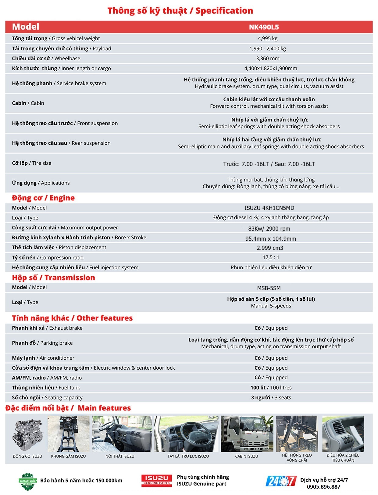 – Bảo hành: 05 năm hoặc 150.000 km ( Tùy theo điều kiện nào đến trước)